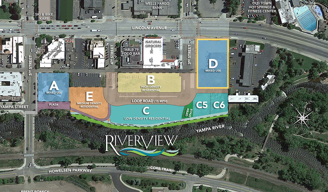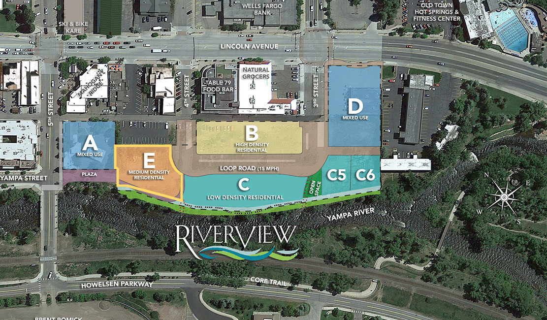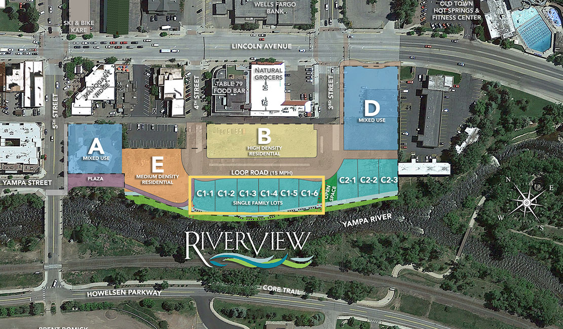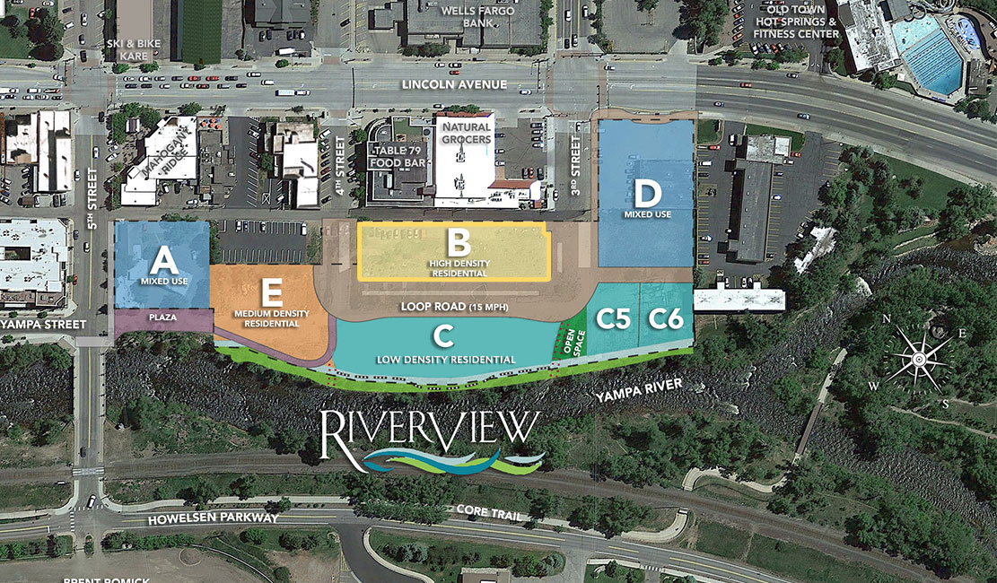 - With only a public plaza between site A and the Yampa River, this is the highest density of any riverfront parcel in Steamboat Spring.